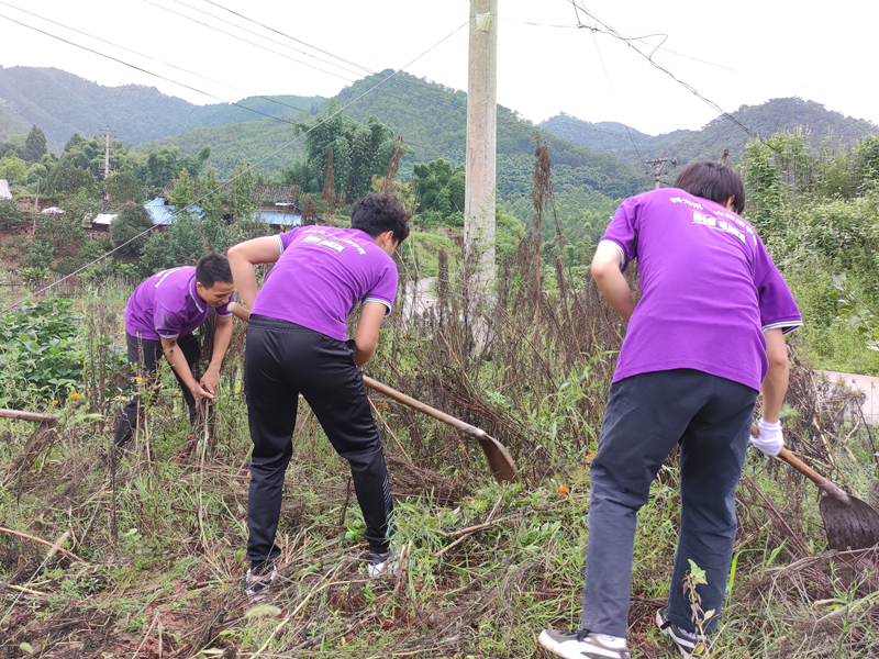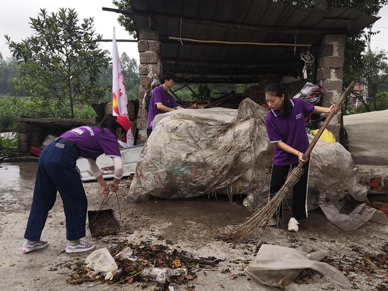 上午10点,为了活动的顺利开展,两位书记首先带领同学们走访各位居民,据走访调查天星村由7个下属社26个自然村民小组组成,家庭户籍数1126户,人口数3485人。其中:五保户48人,低保户58户,102人;2018年,天星村被确定为相对滞后村,全村建卡贫困户28户,74人享受政策,25户65人已脱贫,3户9人未脱贫。了解基本情况后,志愿者们与天星村村干部一起去村里挨家挨户宣传人居环境整治政策,参与卫生环境打扫,做好示范引领。之后,志愿者们分成了两支小分队,一支跟两位书记去一村民家打扫院落,一支跟胡冰瑶老师去帮助村民老刘家收拾、规划庭院,推动天星村清洁示范院落建设。过程中,两位驻村工作队书记、胡老师、同学们分工明确,密切配合,搬枯柴、运砖块、提水泥、扫坝子、堆谷物、规划庭院等。同学们拿着比人高的扫帚打扫着,背着大大的背篓来回运送枯柴,把横倒在公路上的枯枝抬进林子里,把锋利的铁棚片抬进屋檐下。每一位同学都非常勤劳、努力,汗水浸湿了大家的衣衫,头发也早已被汗水洗过一遍,没有怨言,没有懈怠,有的只是一颗热情、苦干的心。