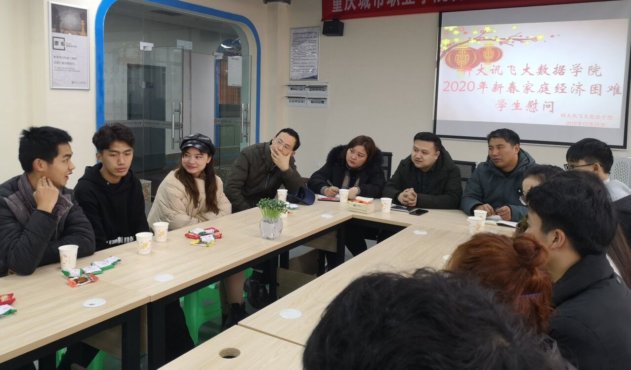 12月25日,科大讯飞大数据学院在明华楼3楼举行2020年新春家庭经济困难学生慰问座谈会,学工部部长李楠、大数据学院支部书记潘峰、副院长刘振栋、执行副院长邓丹、全体辅导员及家庭经济困难学生代表参会。